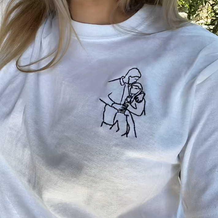 Laat jouw favoriete foto omzetten in een stijlvol en minimalistisch Line Art T shirt. Dit unieke ontwerp vangt een bijzondere herinnering in een strakke en moderne lijntekening. Perfect om iemand te verrassen of om zelf een subtiel en persoonlijk kledingstuk te dragen dat moeiteloos bij elke outfit past.
