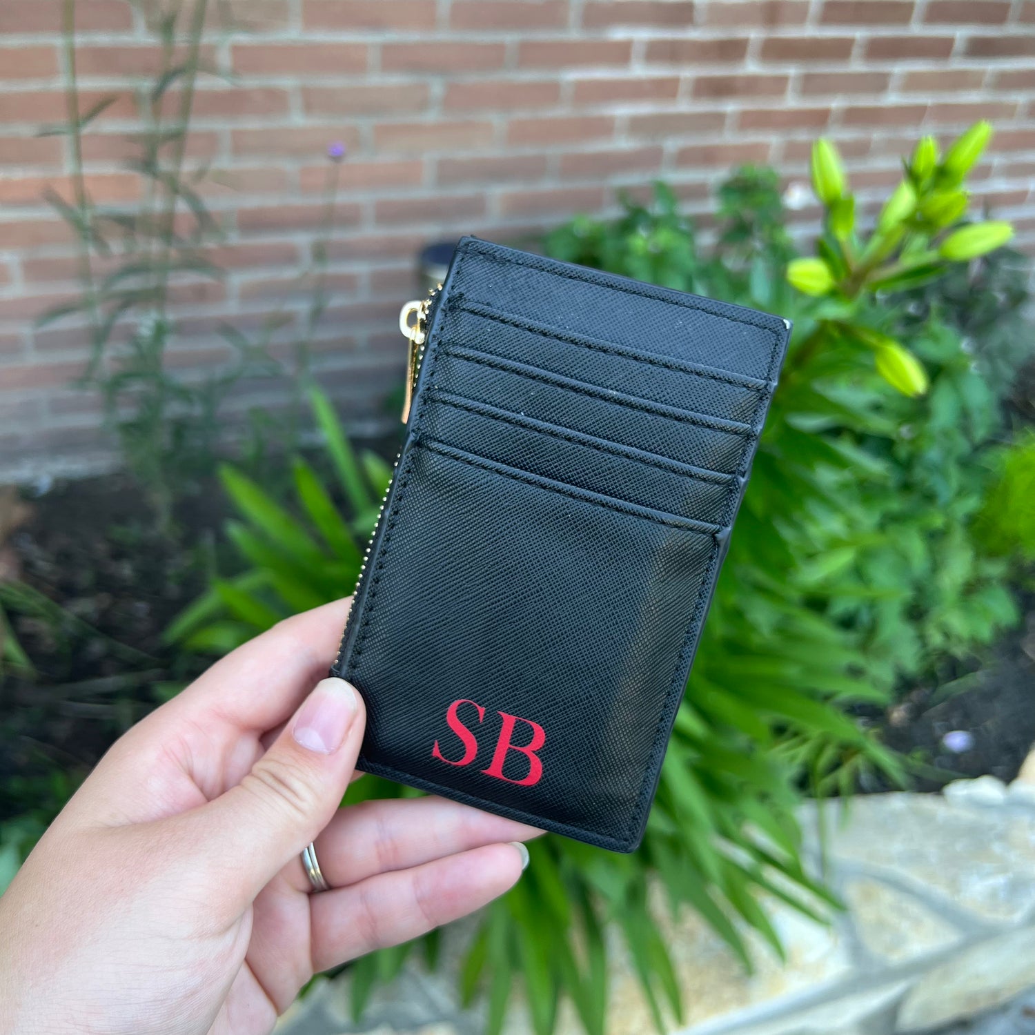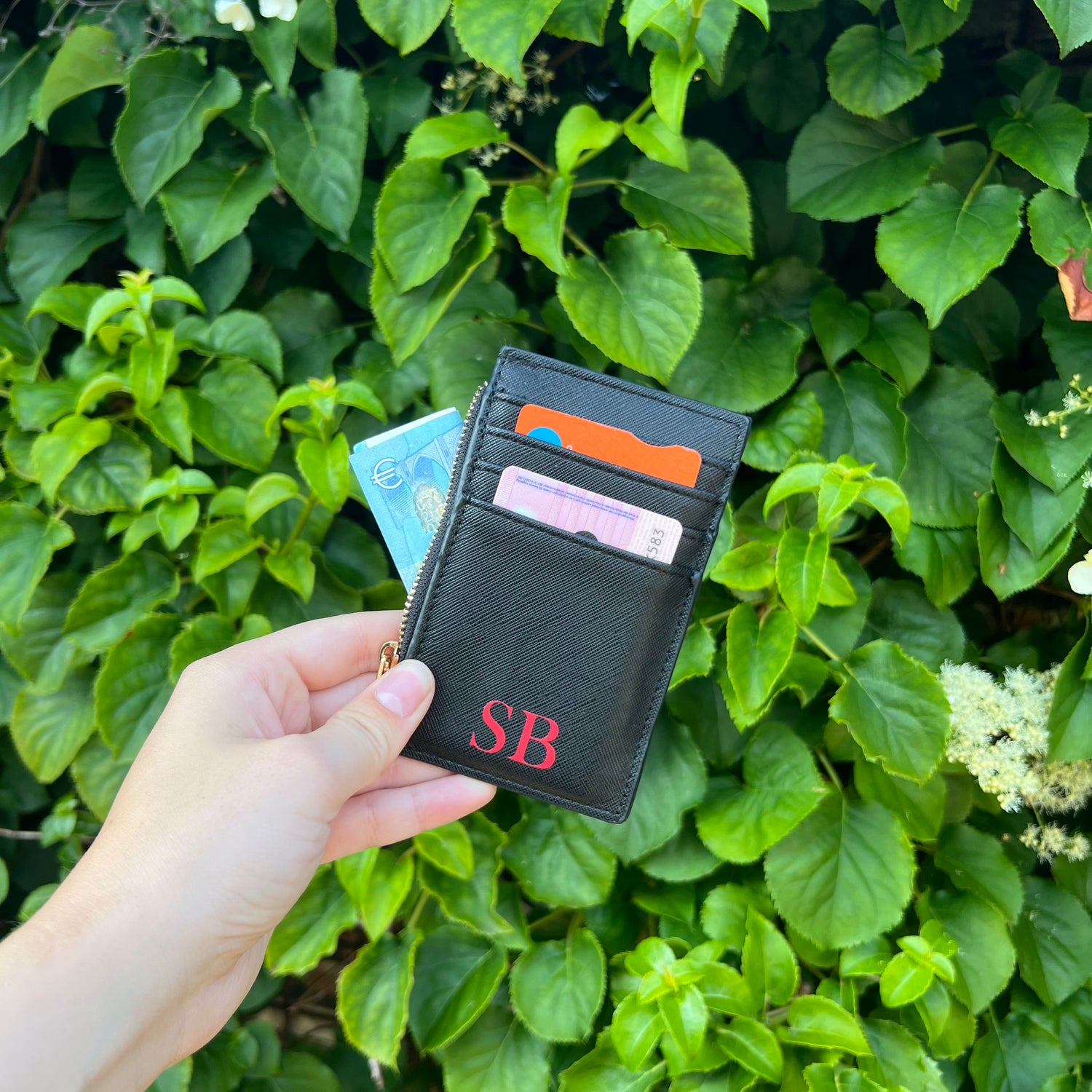 Deze kaarthouder van 12,5 x 7,5 cm is ideaal voor dagelijks gebruik. Op de voorkant kun je je initialen laten bedrukken (max. 4 letters), waardoor het echt jouw eigen item wordt. De houder heeft vier vakjes die elk 2 à 3 pasjes kunnen bevatten – genoeg ruimte voor je belangrijkste kaarten. Daarnaast is er een ritsvakje waar je contant geld of kleine spullen in kwijt kunt. Door het kleine formaat past hij makkelijk in je tas, broek- of jaszak.
